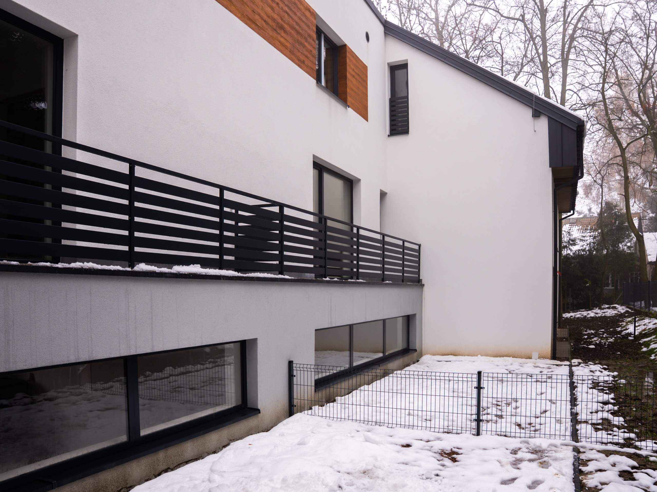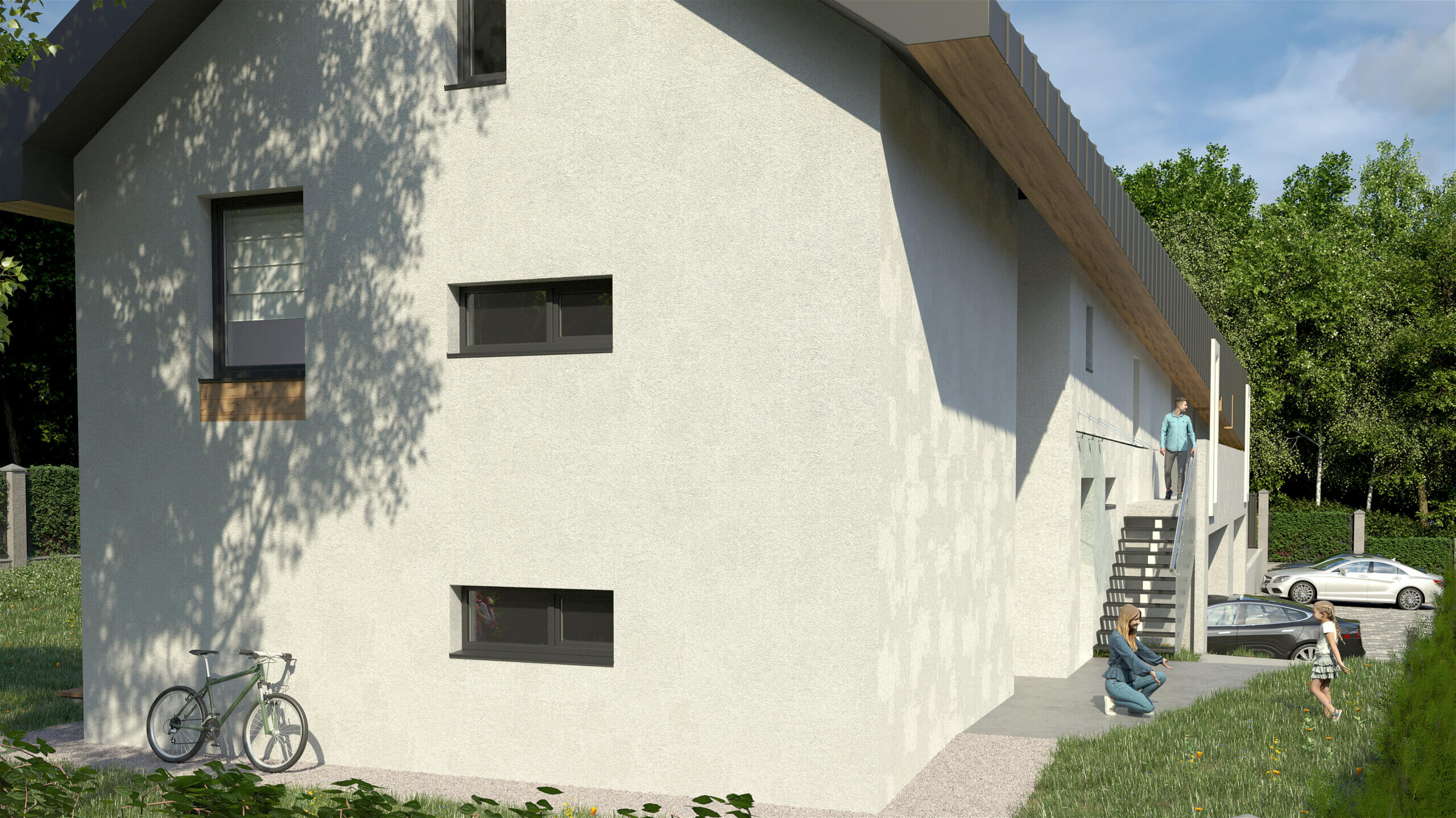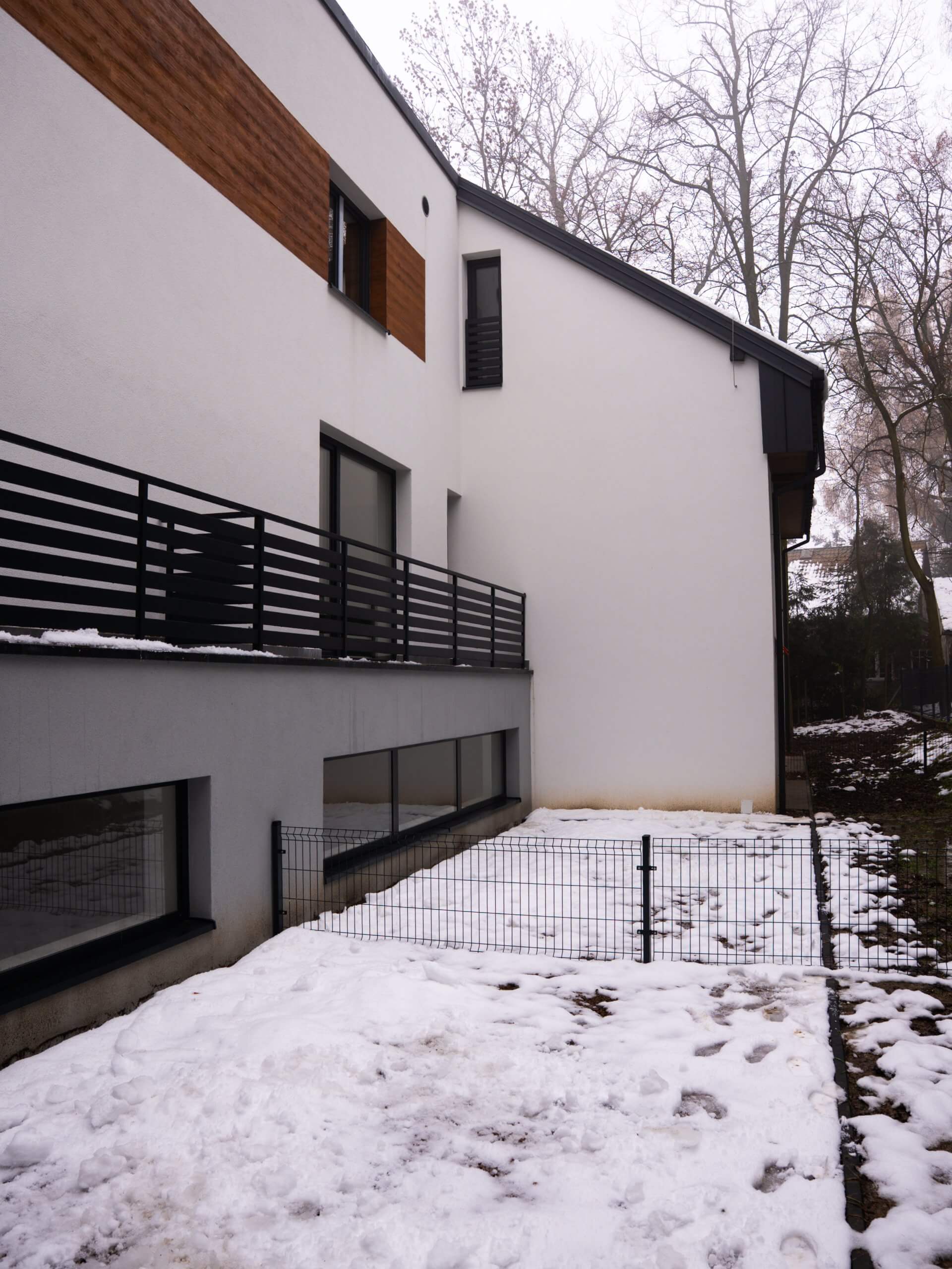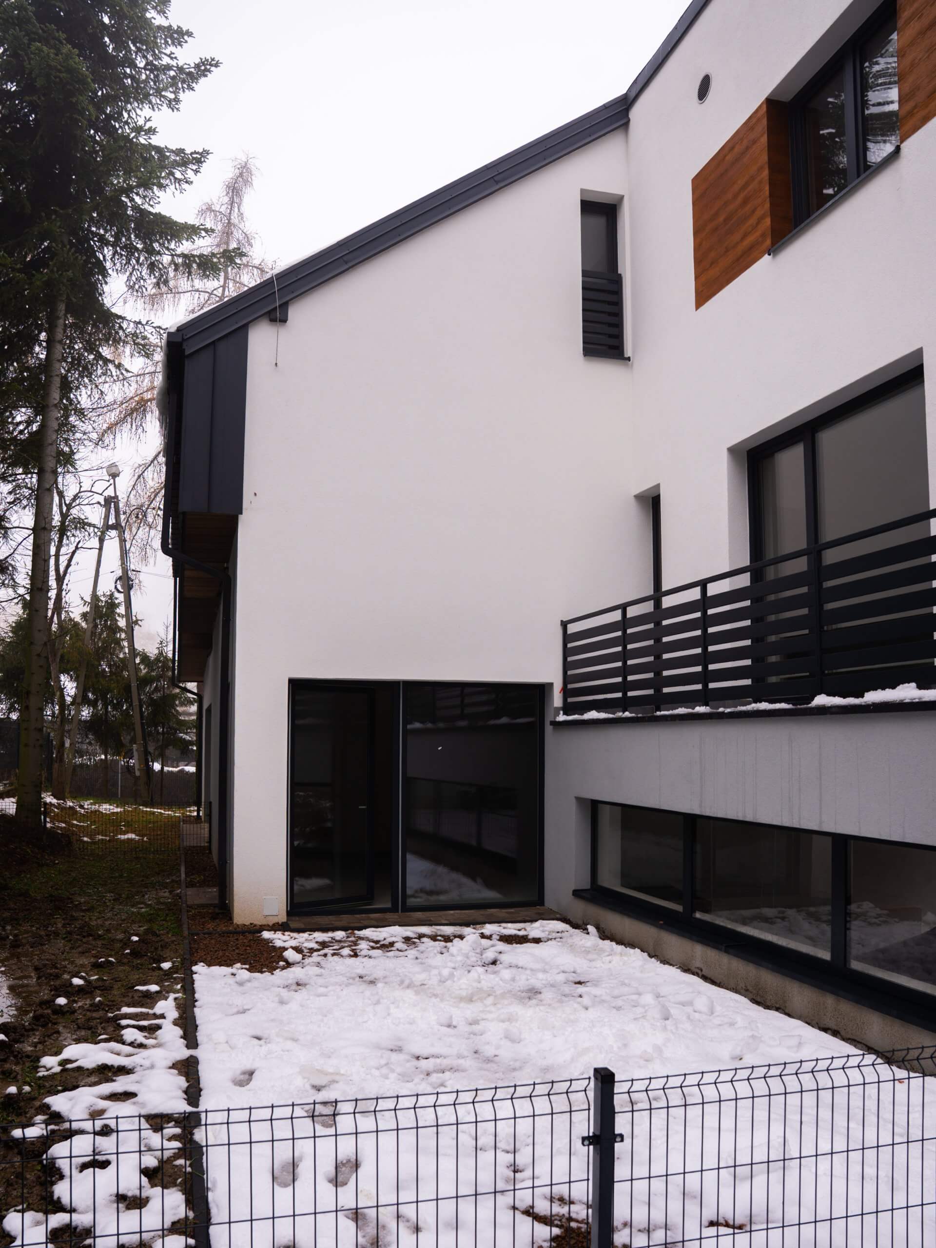 • Wykończenie – tynk silikonowy cienkowarstwowy na siatce w dwóch kolorach, uzupełniony nowoczesną elewacją wentylowaną z lameli kompozytowych oraz akcentami z blachy.