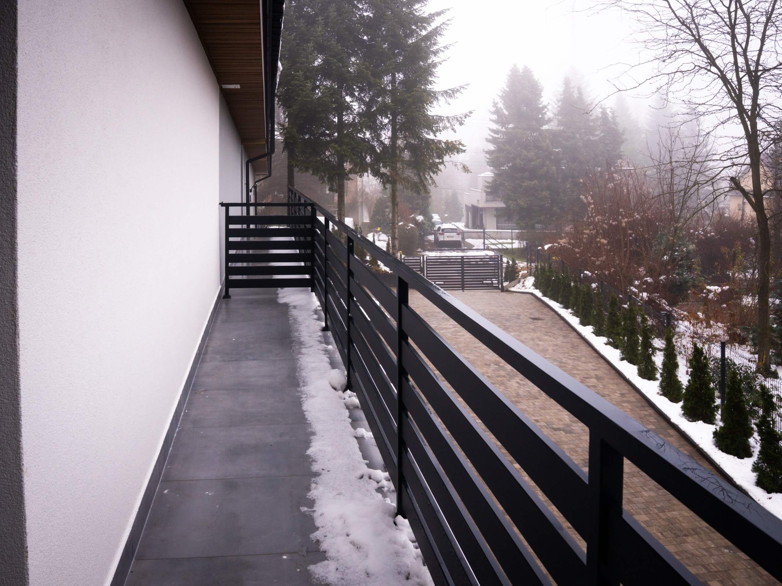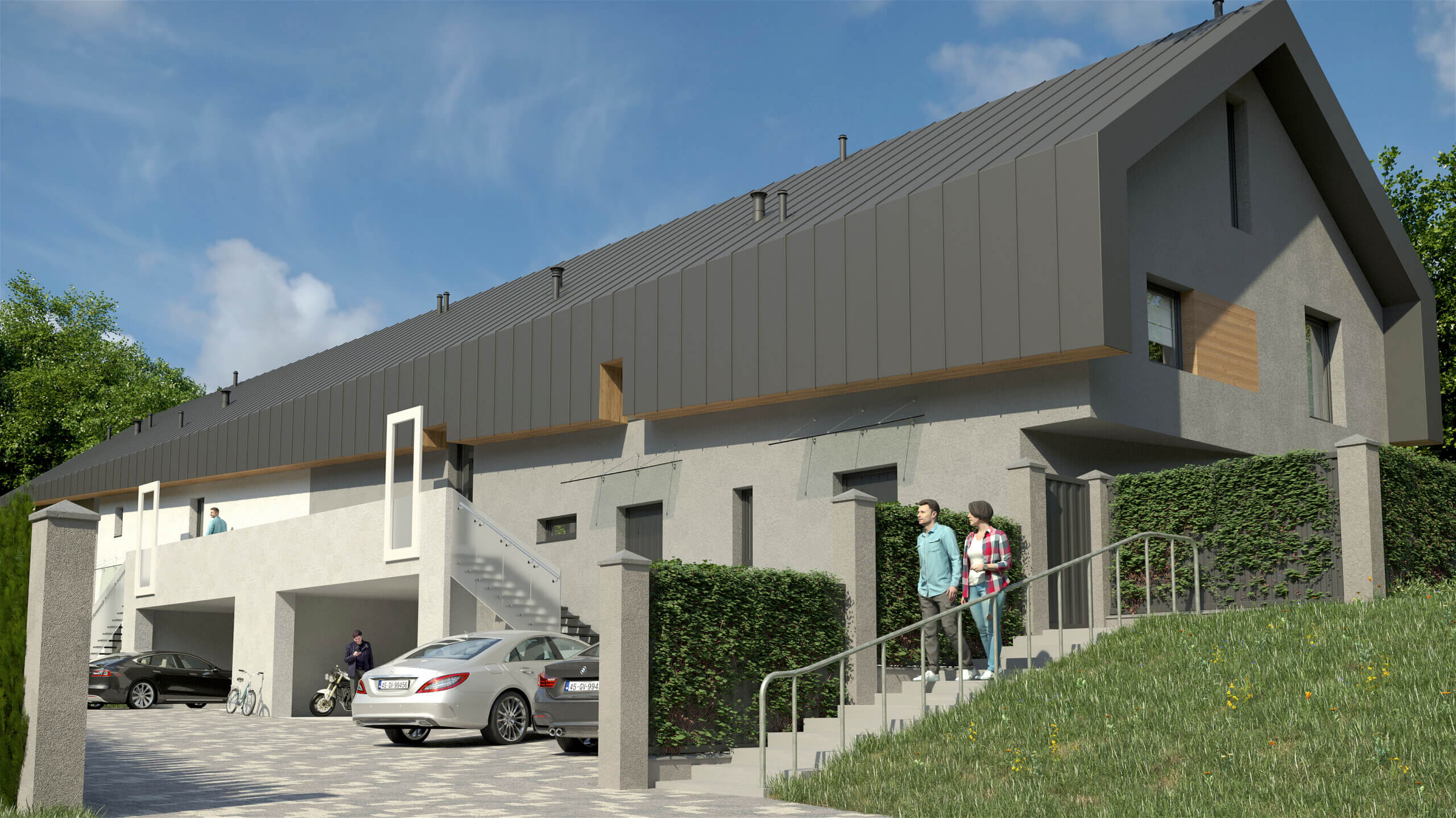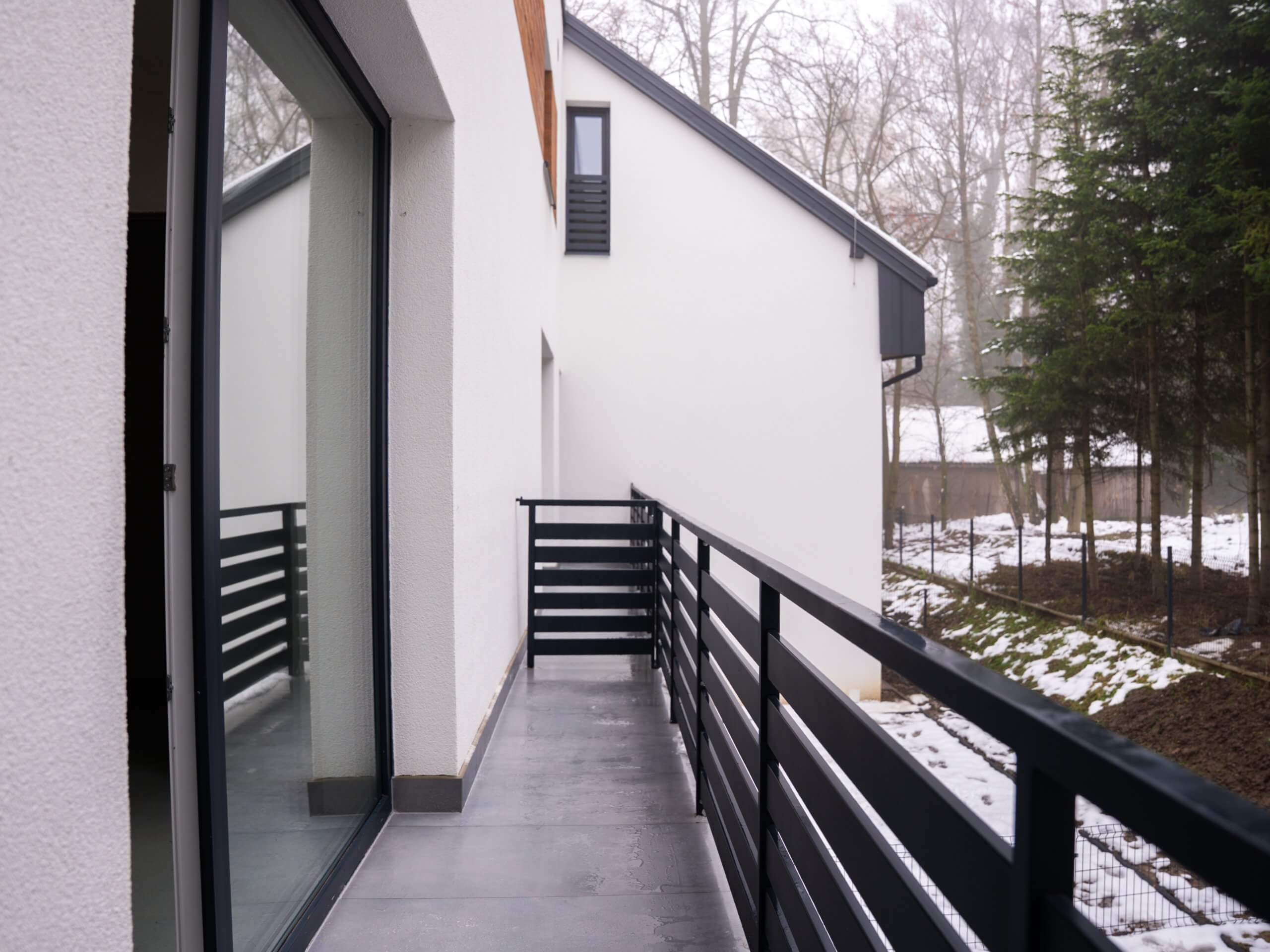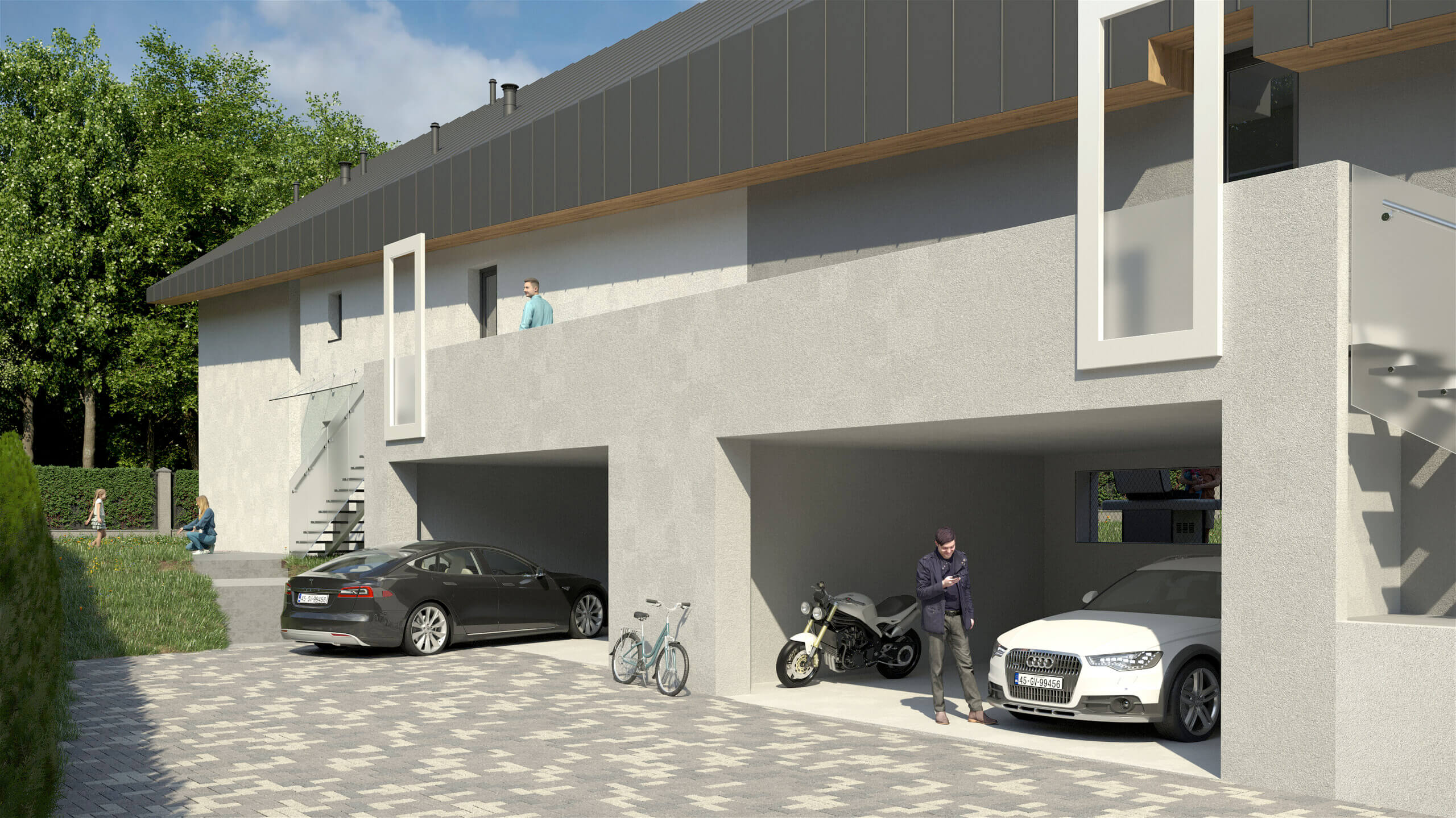 • Wykończenie – tynk silikonowy cienkowarstwowy na siatce w dwóch kolorach, uzupełniony nowoczesną elewacją wentylowaną z lameli kompozytowych oraz akcentami z blachy.