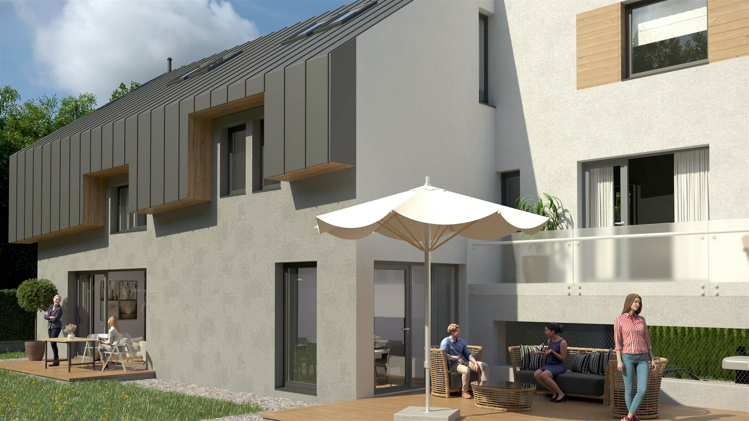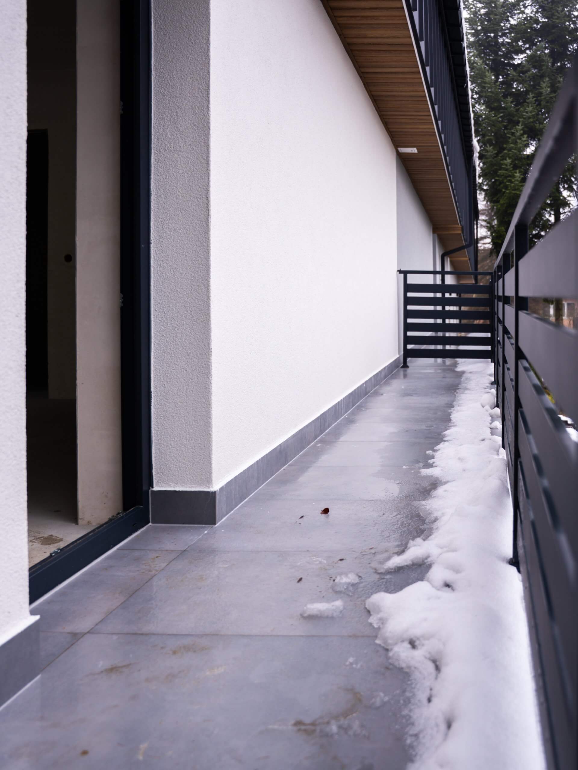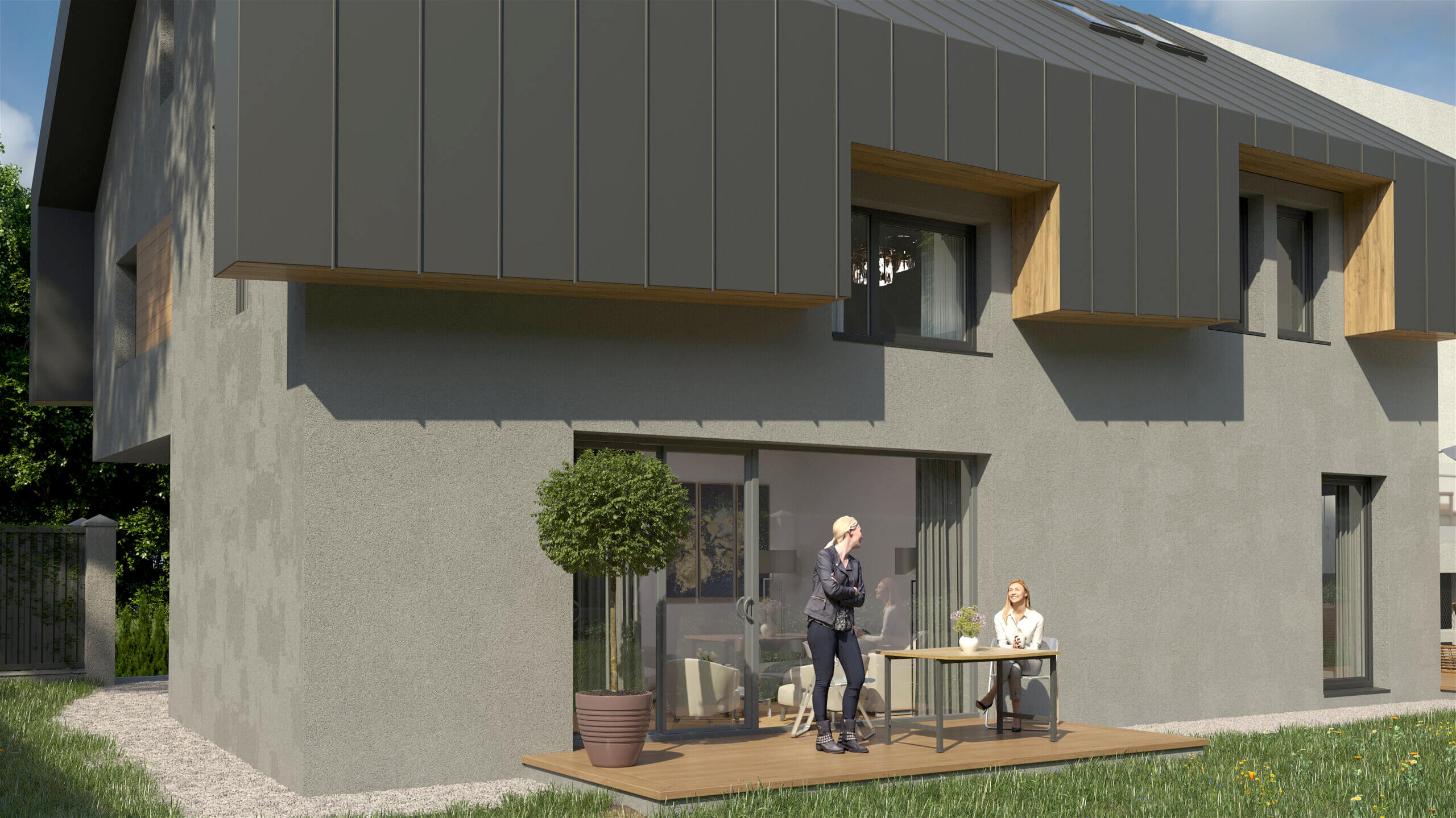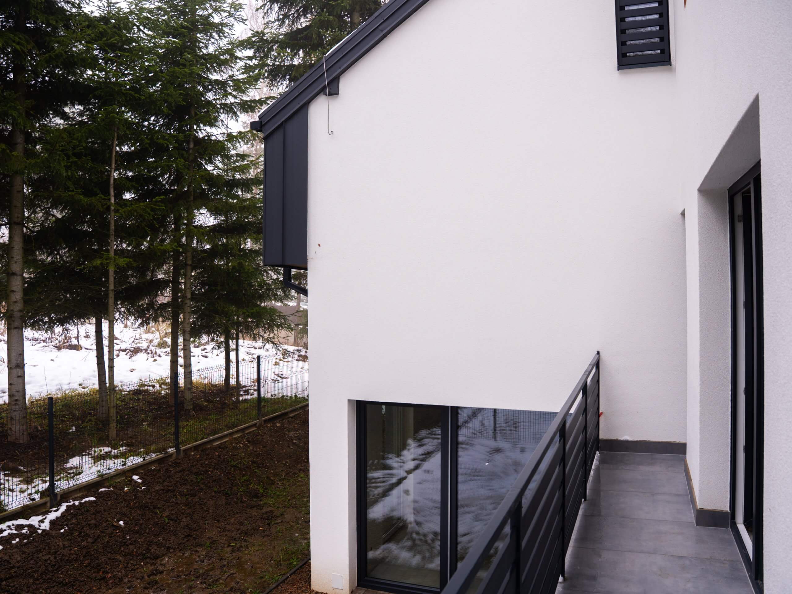 • Wykończenie – tynk silikonowy cienkowarstwowy na siatce w dwóch kolorach, uzupełniony nowoczesną elewacją wentylowaną z lameli kompozytowych oraz akcentami z blachy.