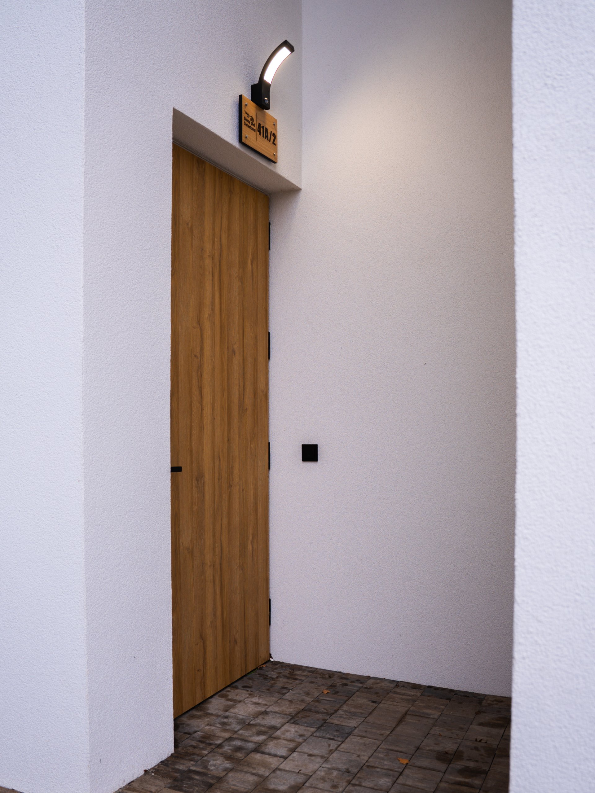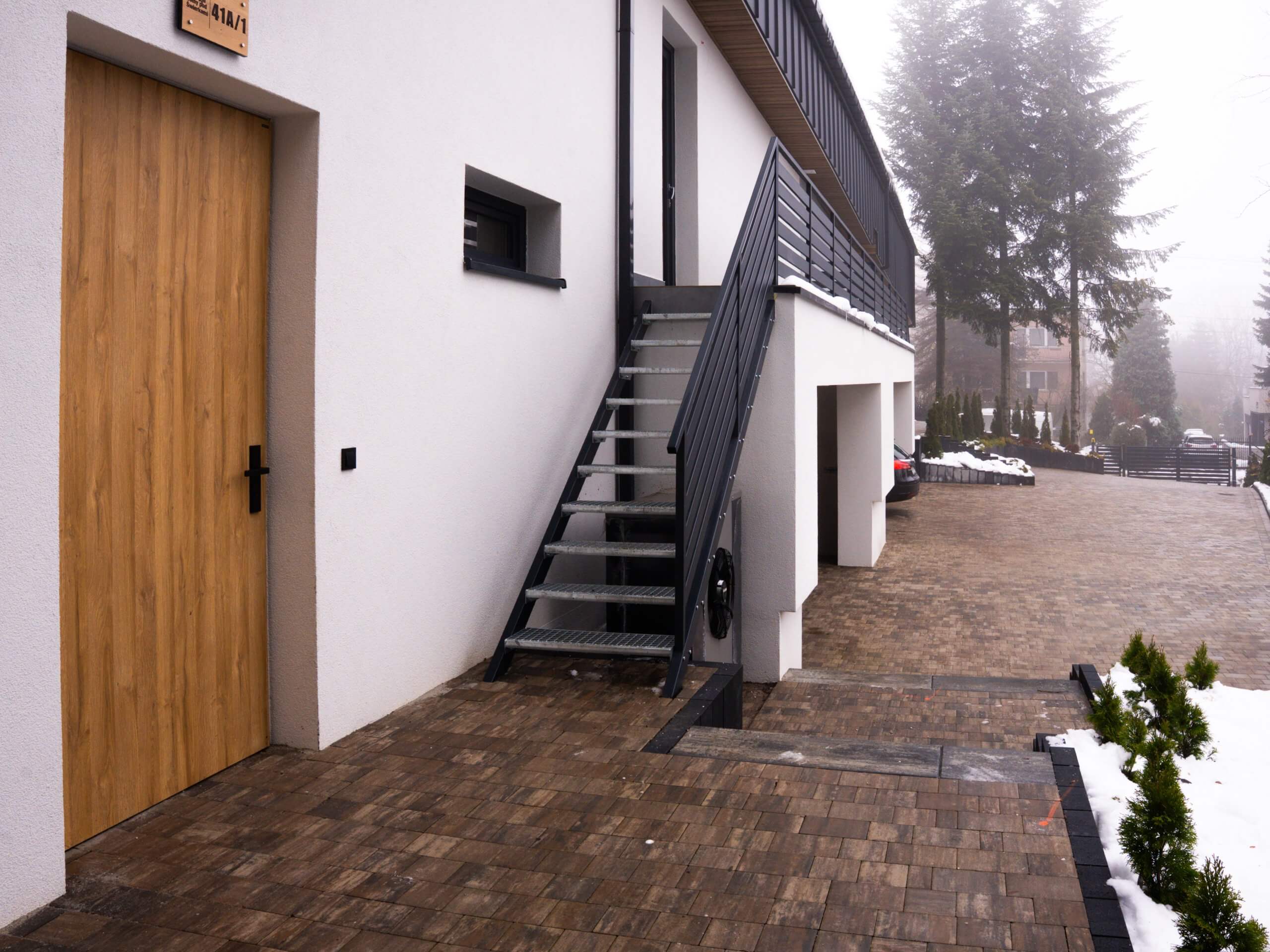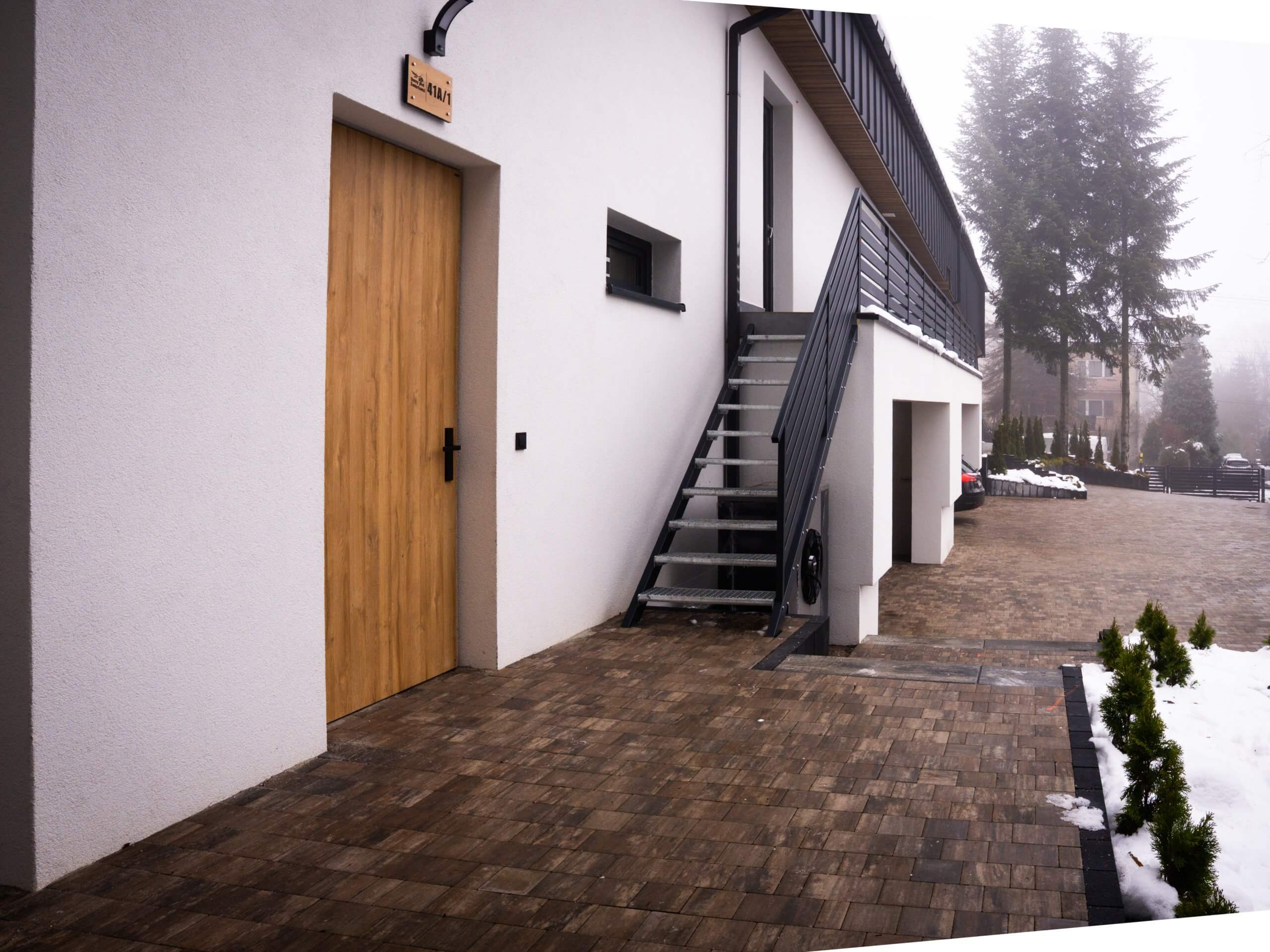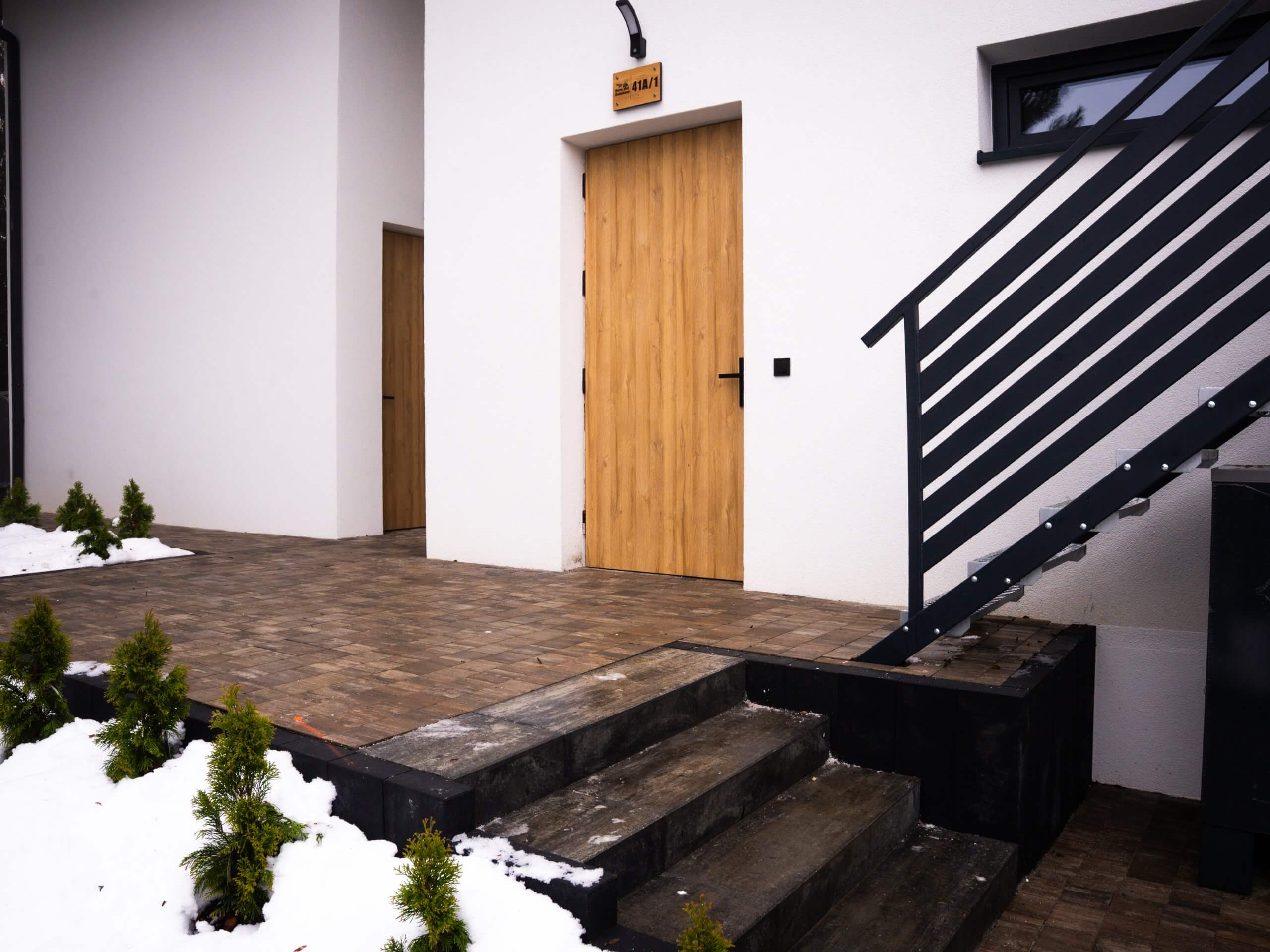 • Drzwi wejściowe – solidne, metalowe lub aluminiowe, wyposażone w próg, szyld i klamkę, gwarantujące bezpieczeństwo i trwałość.