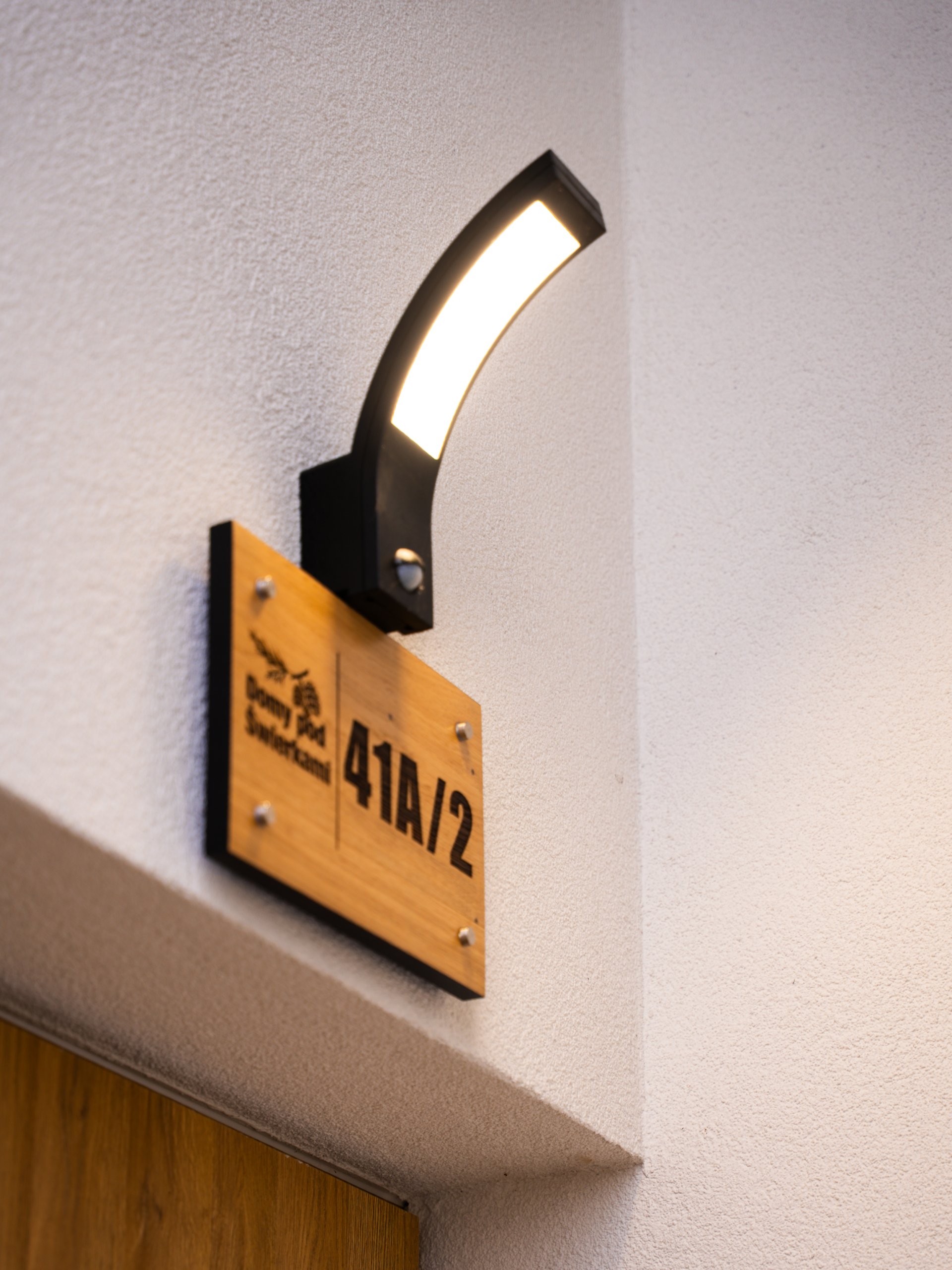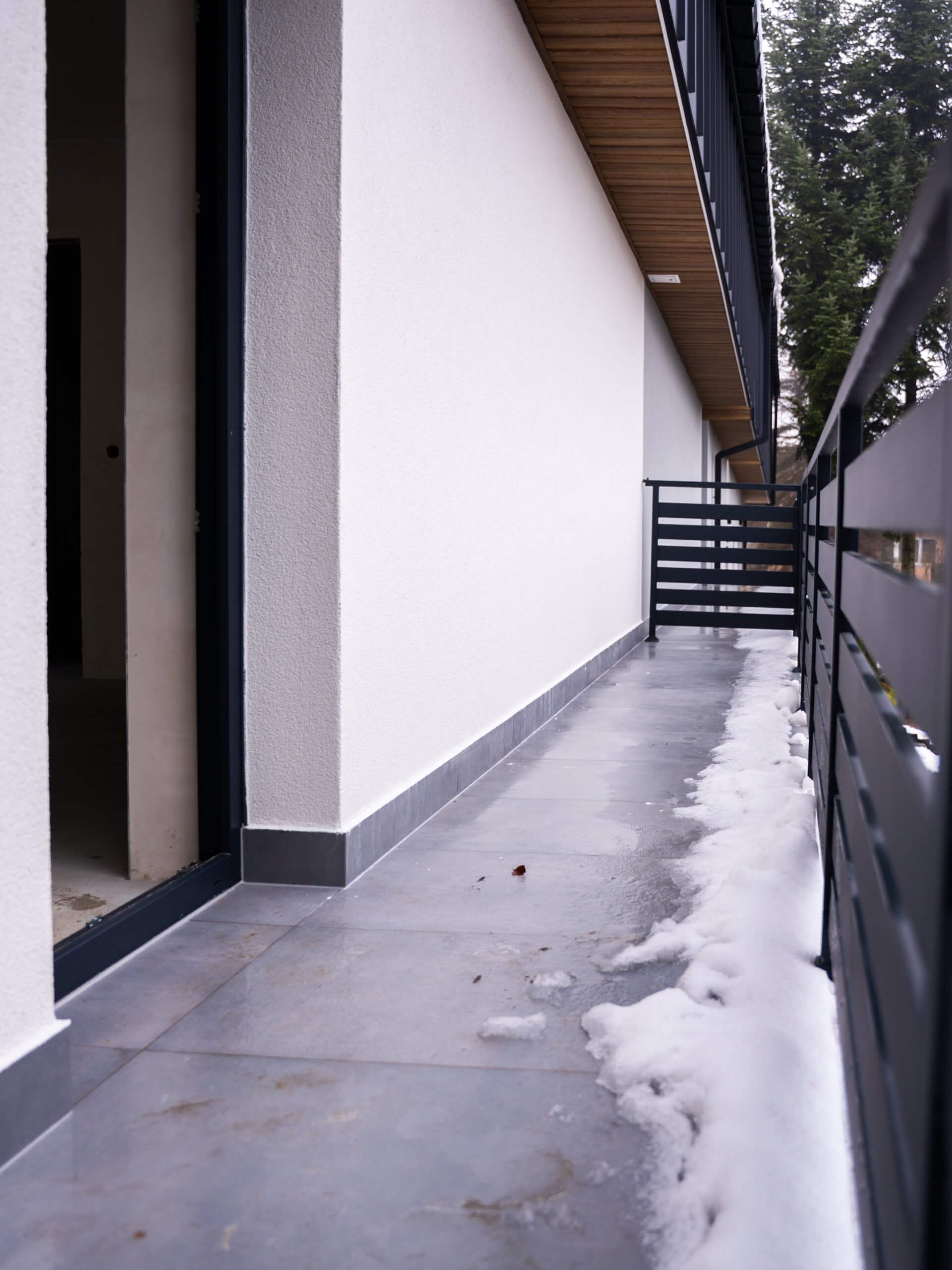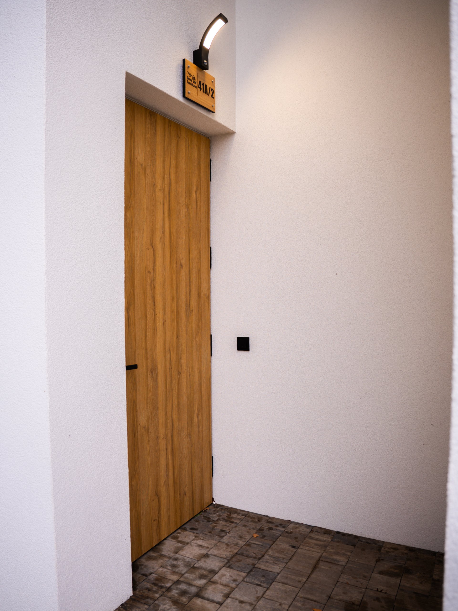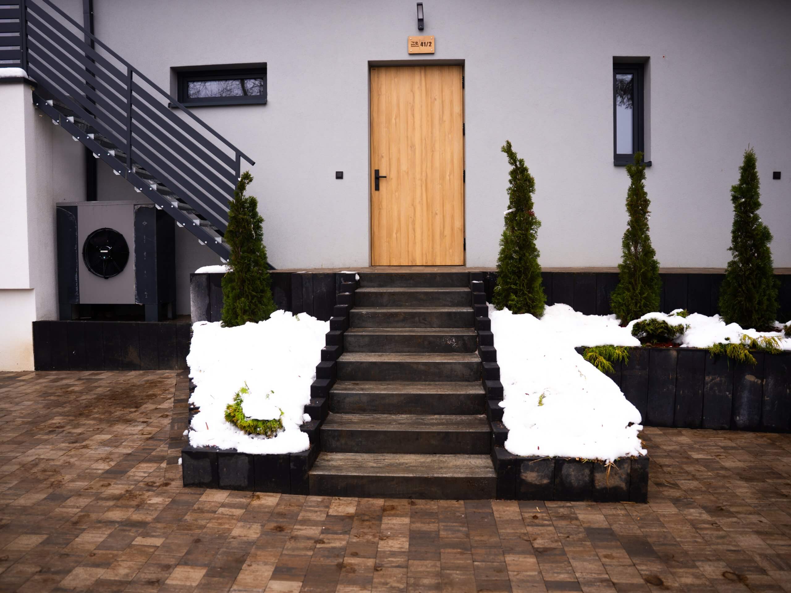 • Drzwi wejściowe – solidne, metalowe lub aluminiowe, wyposażone w próg, szyld i klamkę, gwarantujące bezpieczeństwo i trwałość.