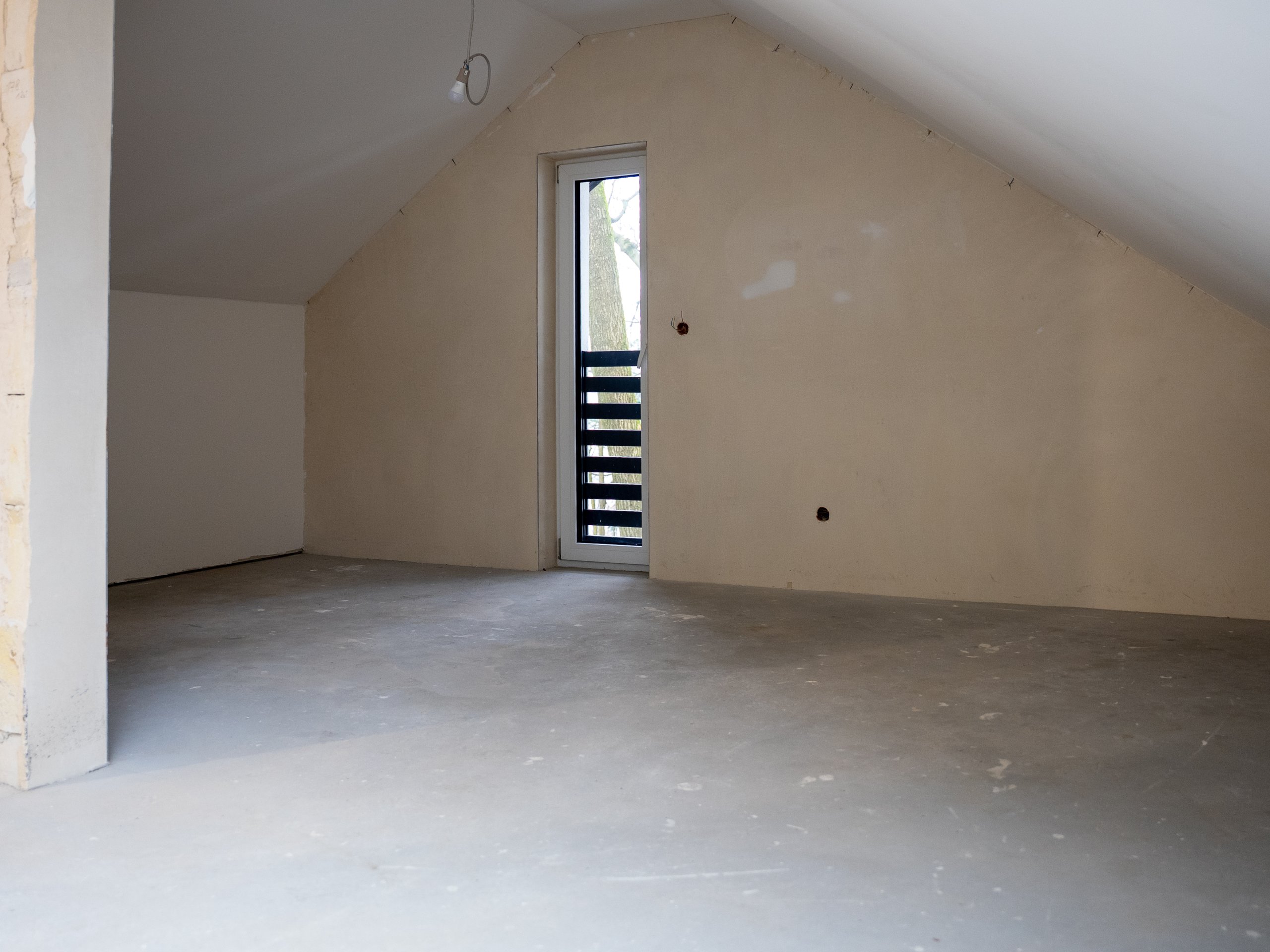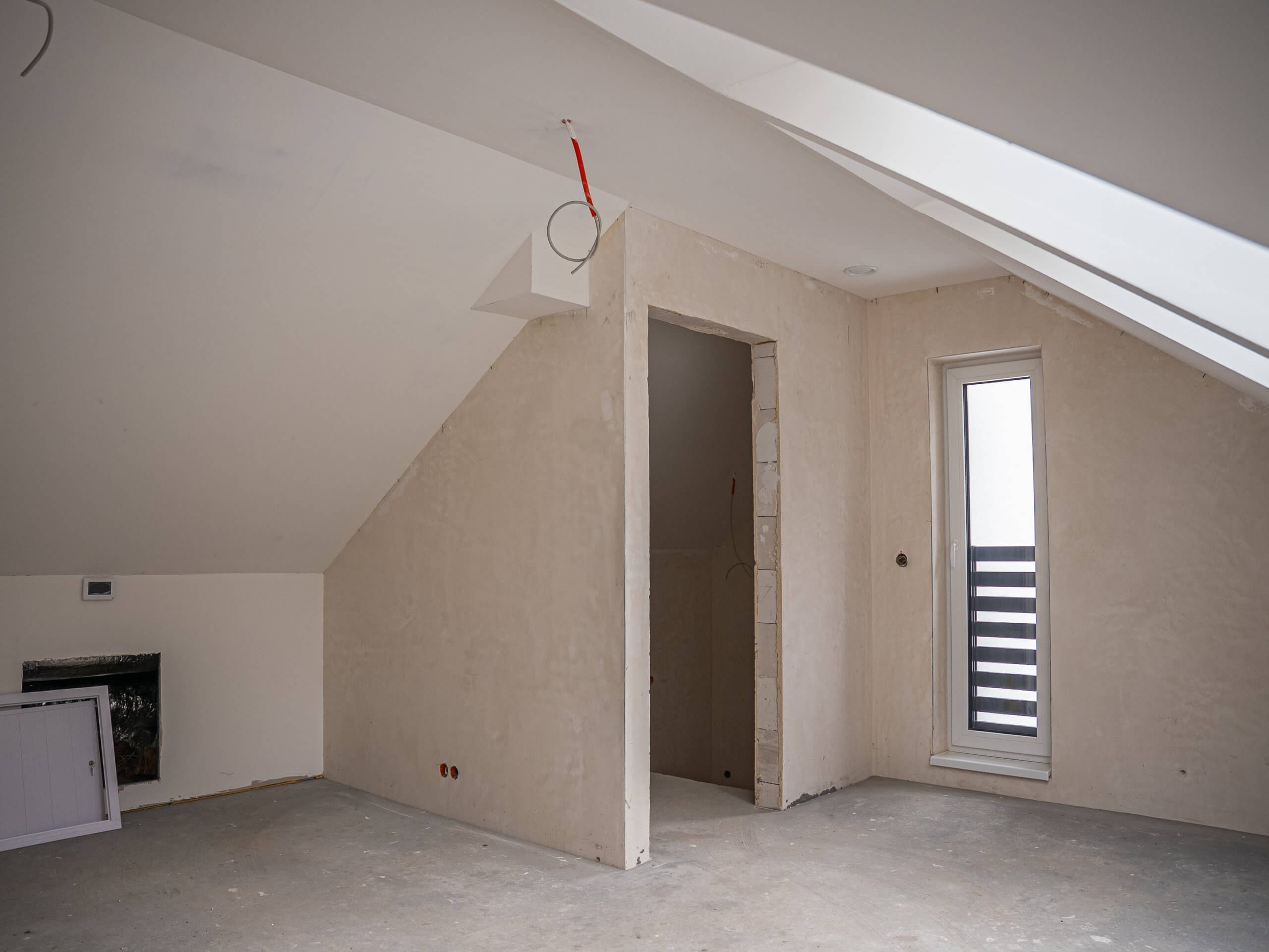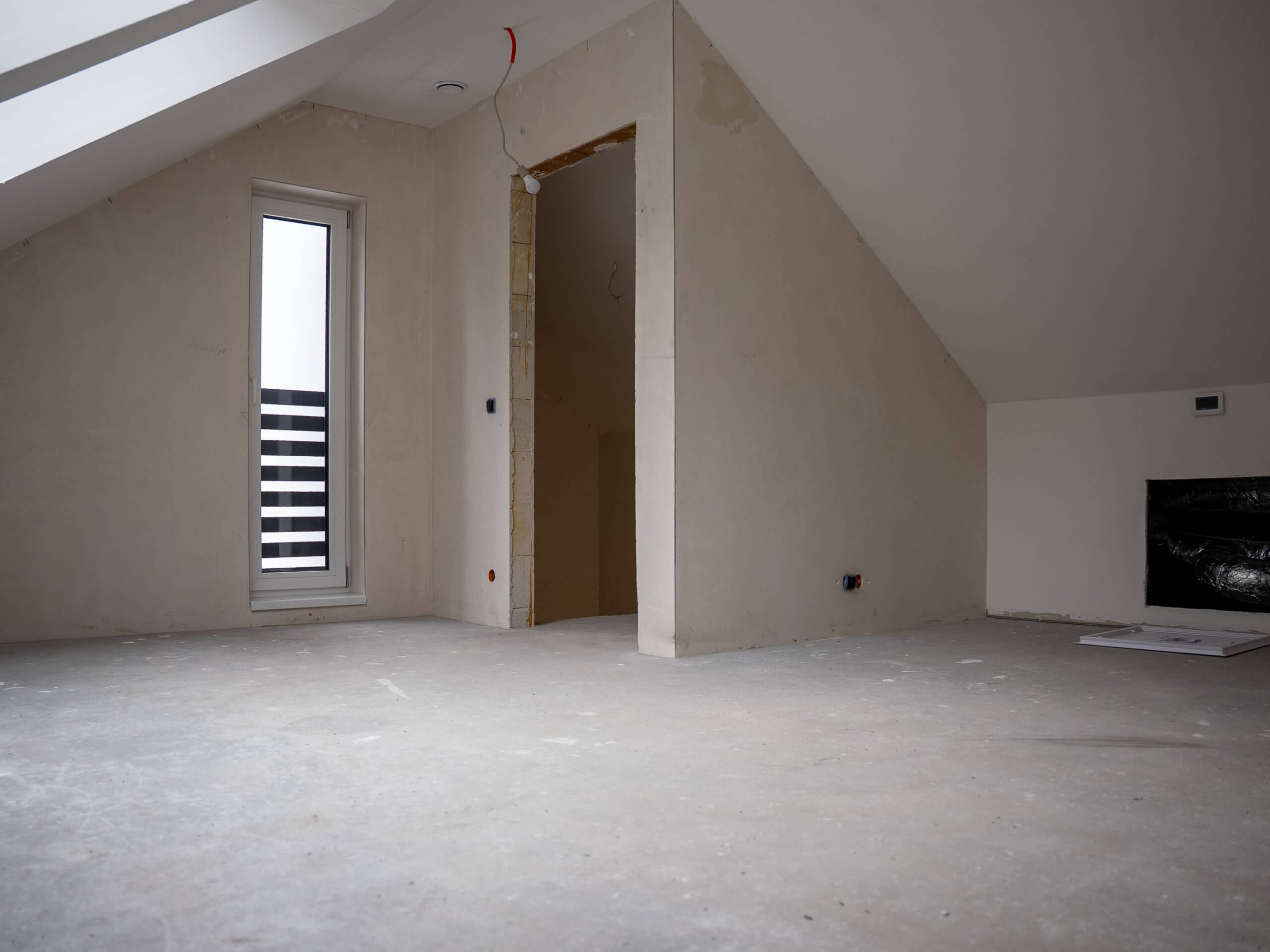 Wykonanie ścian konstrukcyjnych oraz strop na poddaszu. Wykonanie konstrukcji oraz pokrycia dachu, montaż stolarki okiennej. Obróbki blacharskie, orynnowanie. Wykonanie ścian działowych.