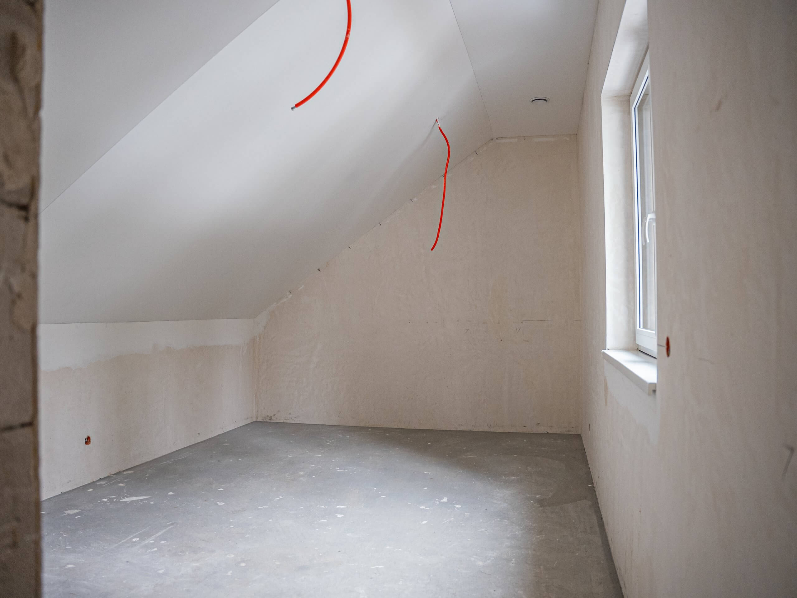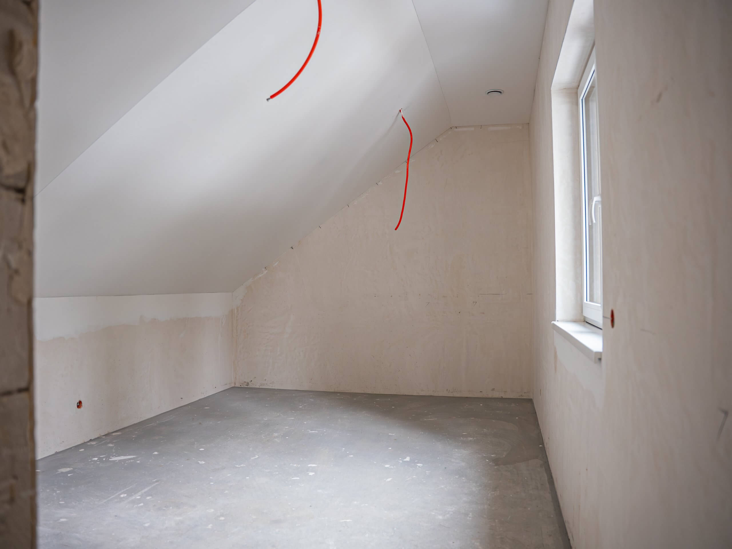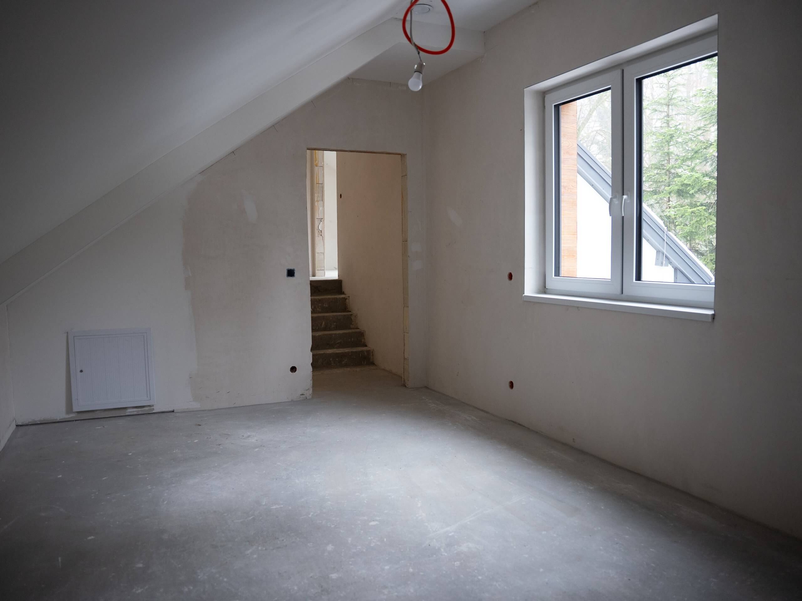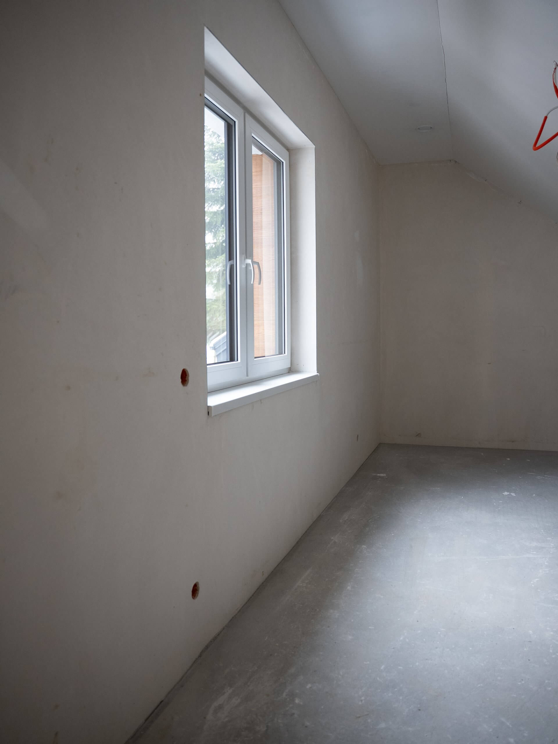 Wykonanie ścian konstrukcyjnych oraz strop na poddaszu. Wykonanie konstrukcji oraz pokrycia dachu, montaż stolarki okiennej. Obróbki blacharskie, orynnowanie. Wykonanie ścian działowych.