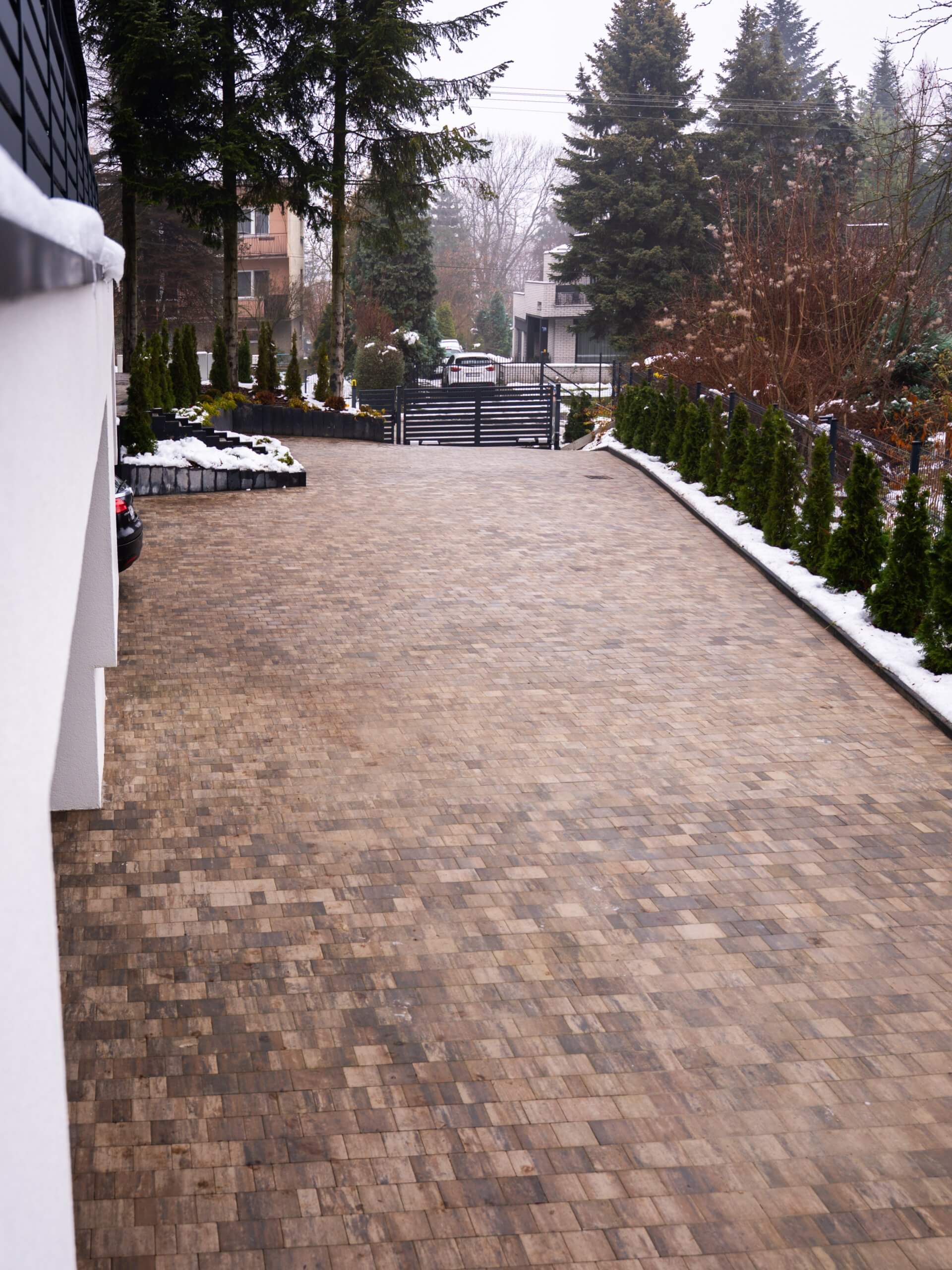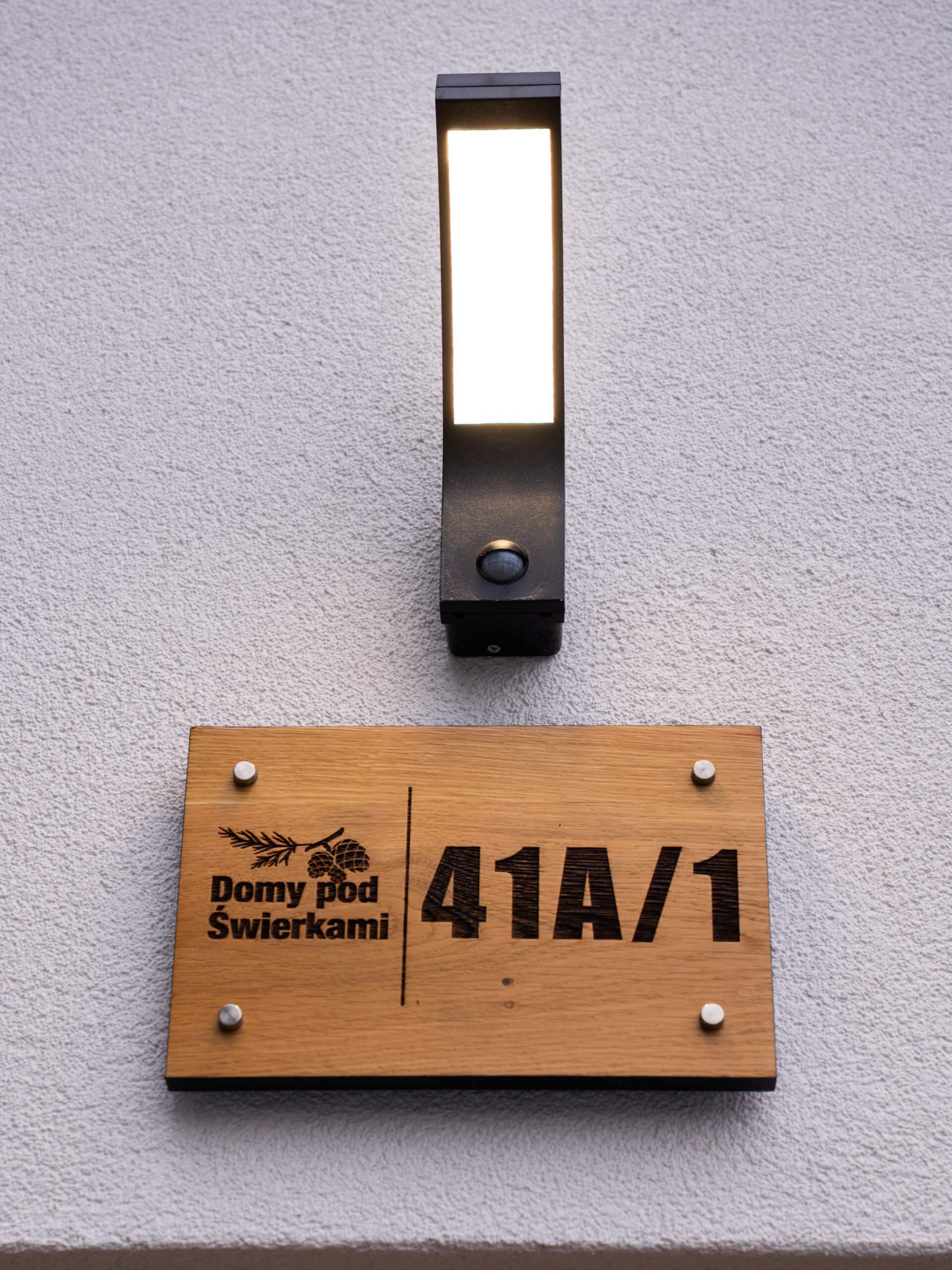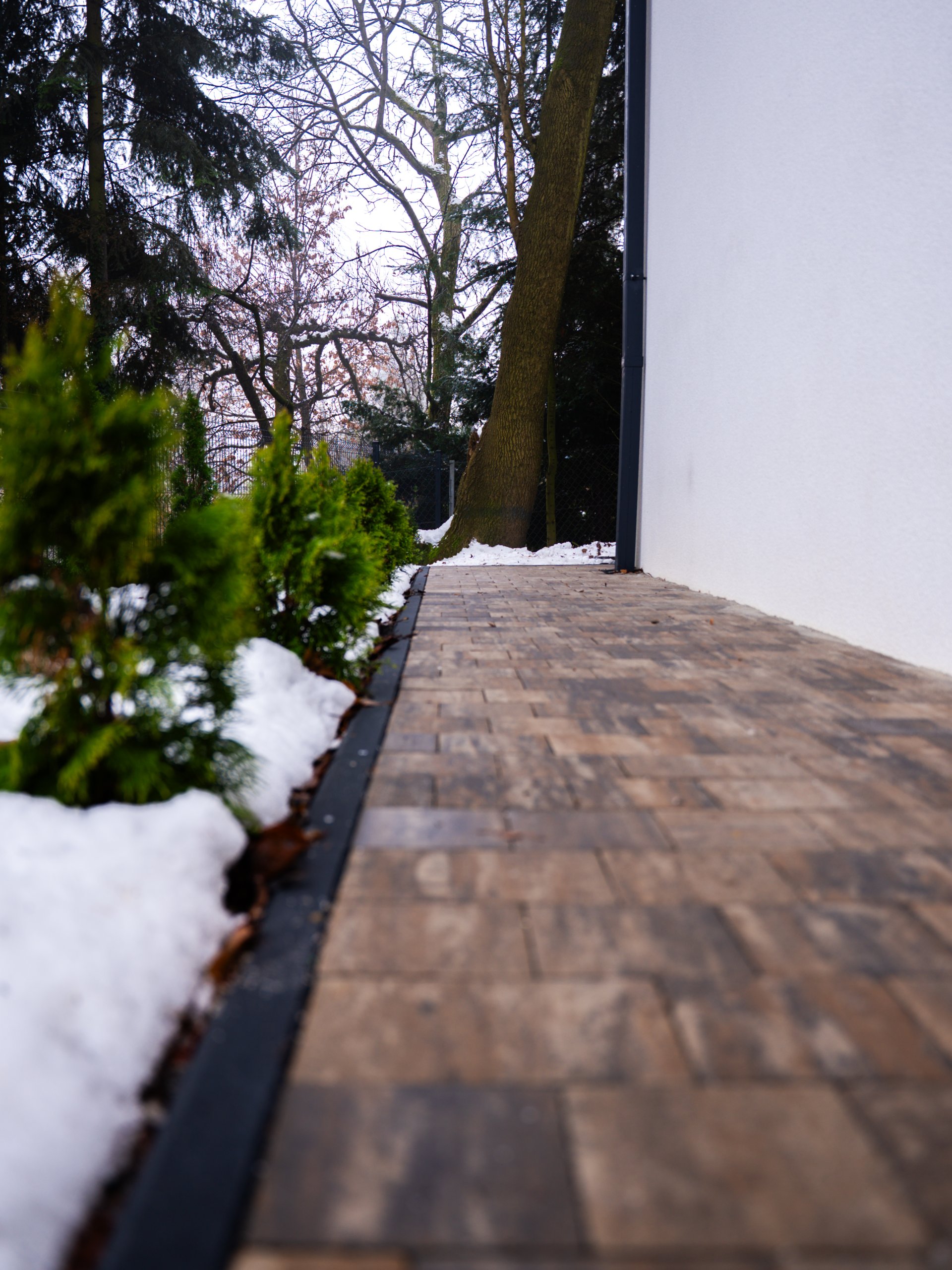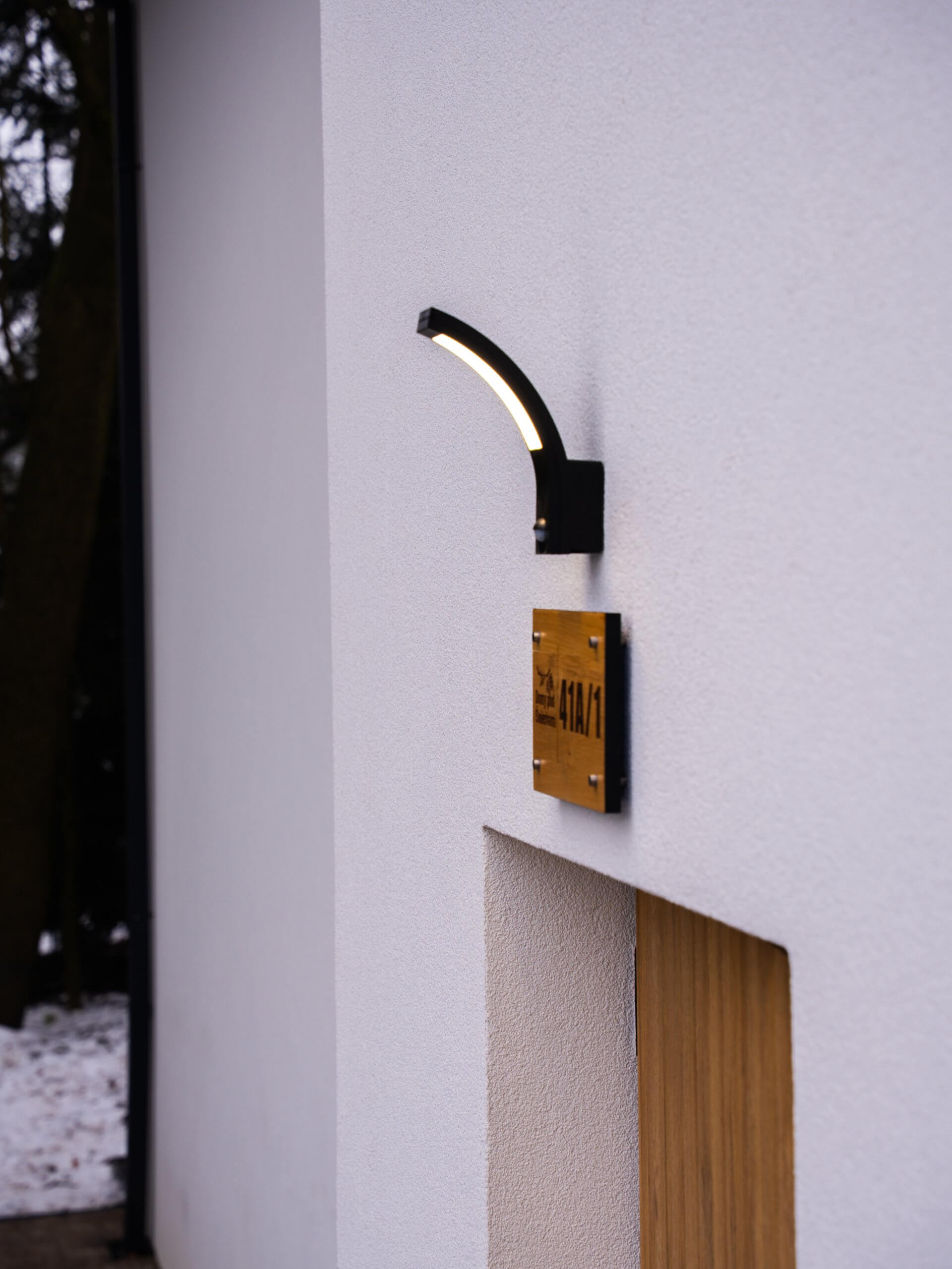 • Podbitka dachowa – wykonana z eleganckiej blachy drewnopodobnej, z wbudowanym oświetleniem LED podkreślającym nowoczesny charakter inwestycji.